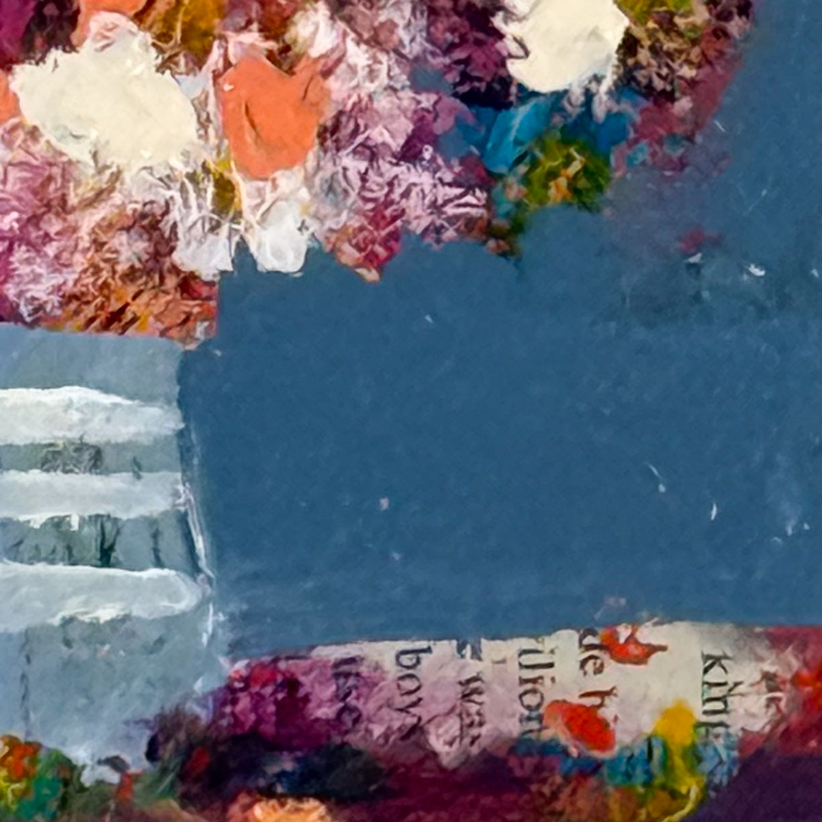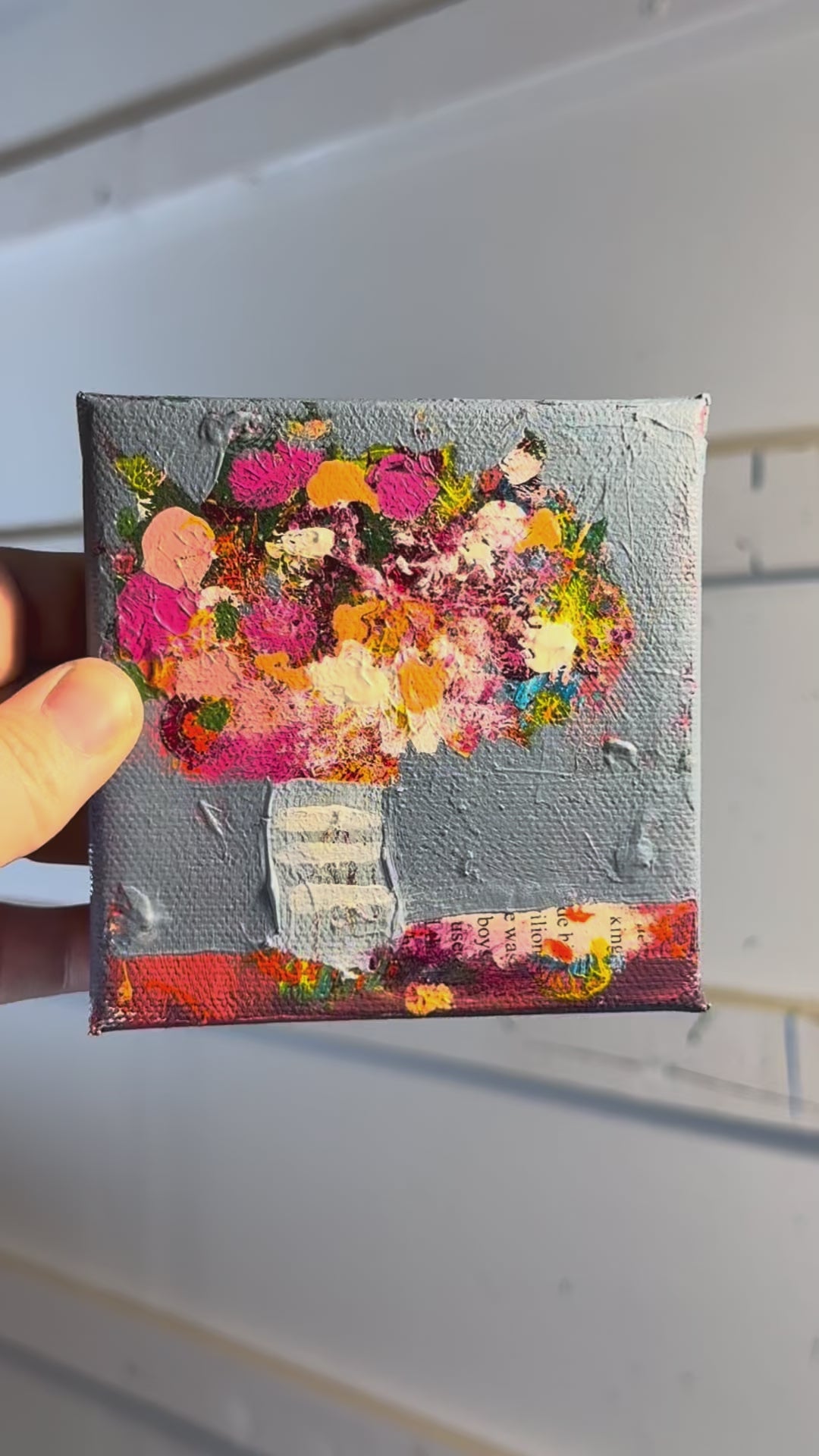 This original mixed-media painting bursts with vibrant joy, featuring a textured bouquet of bright pinks, oranges, yellows, and whites to set in a blue vase. Layers of thick acrylic paint and collaged book pages add depth and whimsy, making each brushstroke feel alive. A perfect statement piece for any space, this artwork brings warmth, color, and playfulness to your walls. Signed and titled on the side and back. Varnished with artwork extending to the sides - ready to hang.