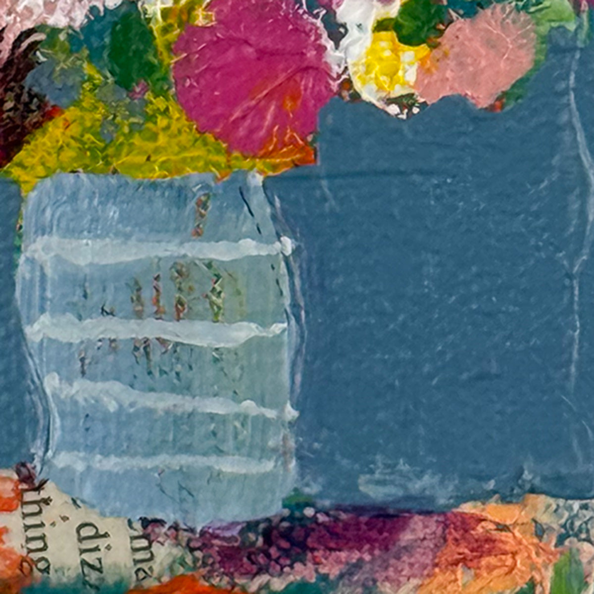 This original mixed-media painting bursts with vibrant joy, featuring a textured bouquet of bright pinks, oranges, yellows, and whites to set in a blue vase. Layers of thick acrylic paint and collaged book pages add depth and whimsy, making each brushstroke feel alive. A perfect statement piece for any space, this artwork brings warmth, color, and playfulness to your walls. Signed and titled on the side and back. Varnished with artwork extending to the sides - ready to hang.