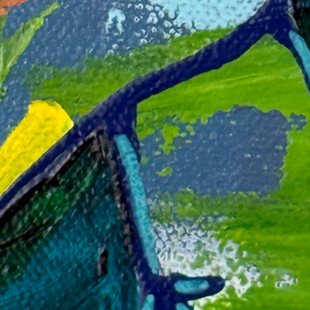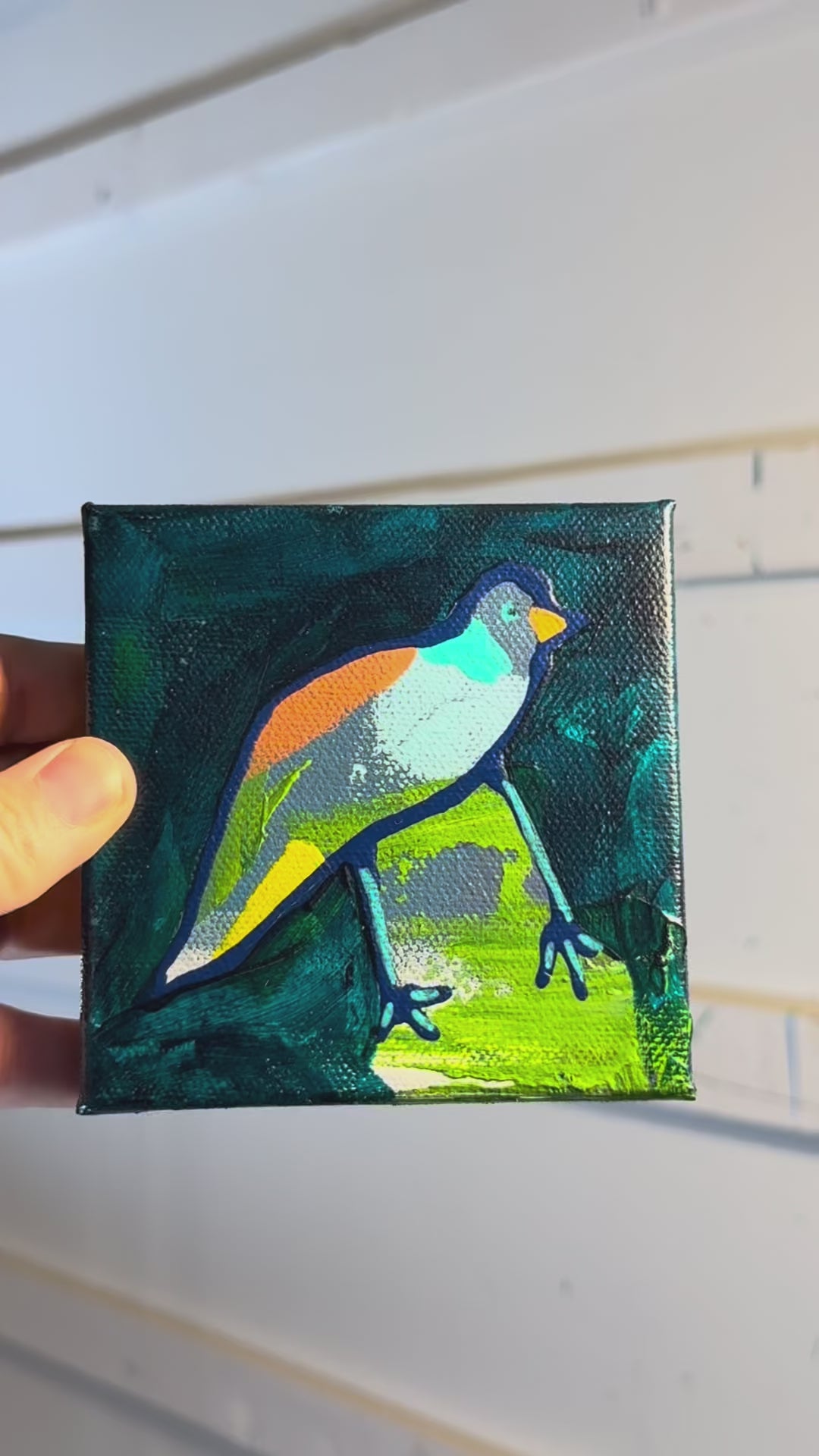 Bring a pop of color and charm to your space with this playful mixed-media bird painting. This little sweetie named "Charlie" is a part of my Joyful Birdies series. Hand-painted with bold strokes of lime green, blue, and orange, the bird's quirky character shines against a deep green background. Layers of collage and acrylic add depth, texture, and one-of-a-kind personality. Signed and titled on the side and back. Varnished with artwork extending to the sides - ready to hang.