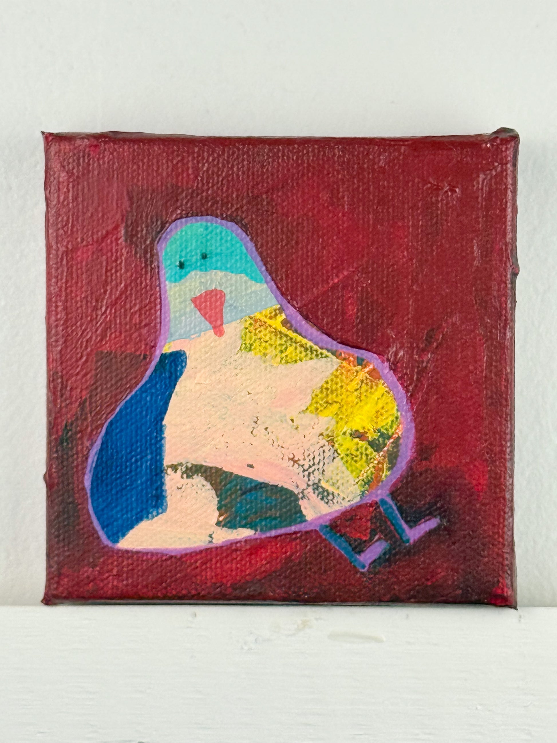 Bring a pop of color and charm to your space with this playful mixed-media bird painting. This little sweetie named "Gus" is a part of my Joyful Birdies series. Hand-painted with bold strokes of peach, blue, and yellow, the bird's quirky character shines against a deep maroon background. Layers of collage and acrylic add depth, texture, and one-of-a-kind personality. Signed on the side and back. Varnished with artwork extending to the sides - ready to hang.