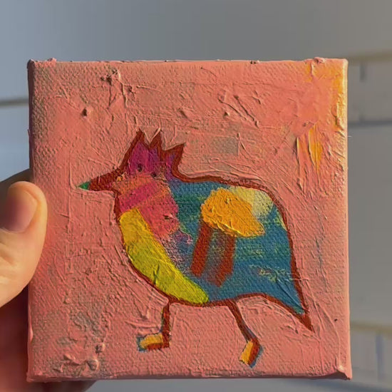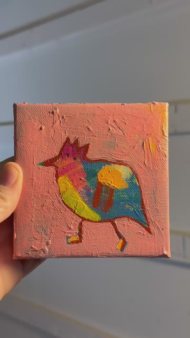 Bring a pop of color and charm to your space with this playful mixed-media bird painting. This little sweetie named "Rose" is a part of my Joyful Birdies series. Hand-painted with bold strokes of blue, orange, and red, the bird's quirky character shines against a pink background. Layers of collage and acrylic add depth, texture, and one-of-a-kind personality. Signed on the side and back. Varnished with artwork extending to the sides - ready to hang.