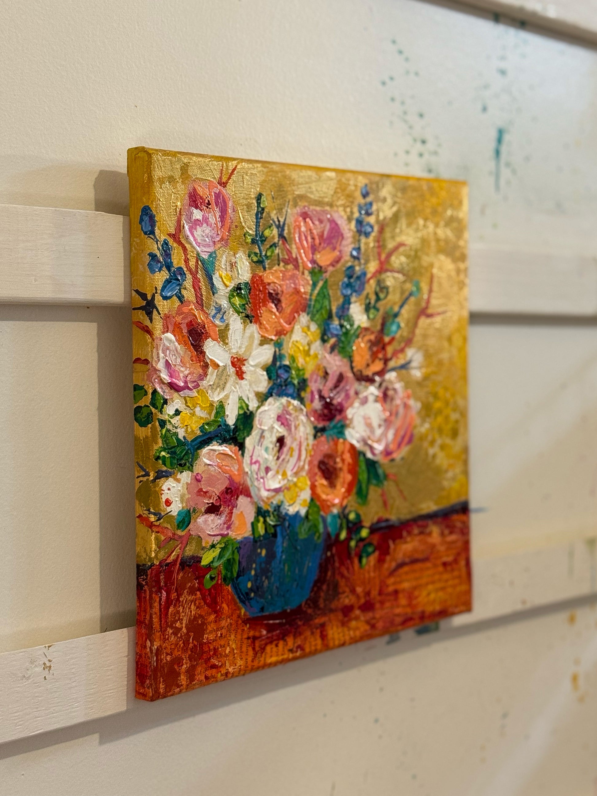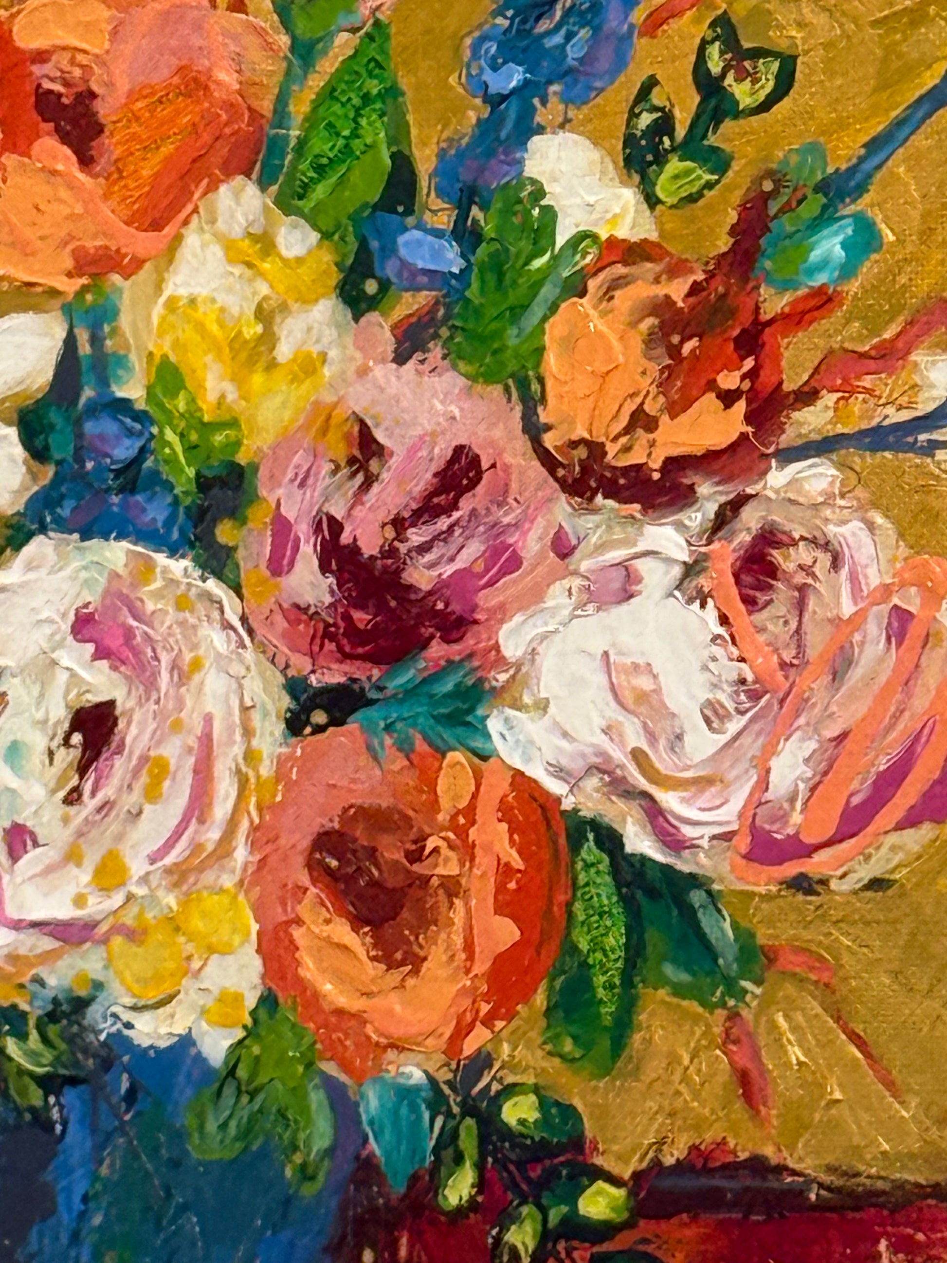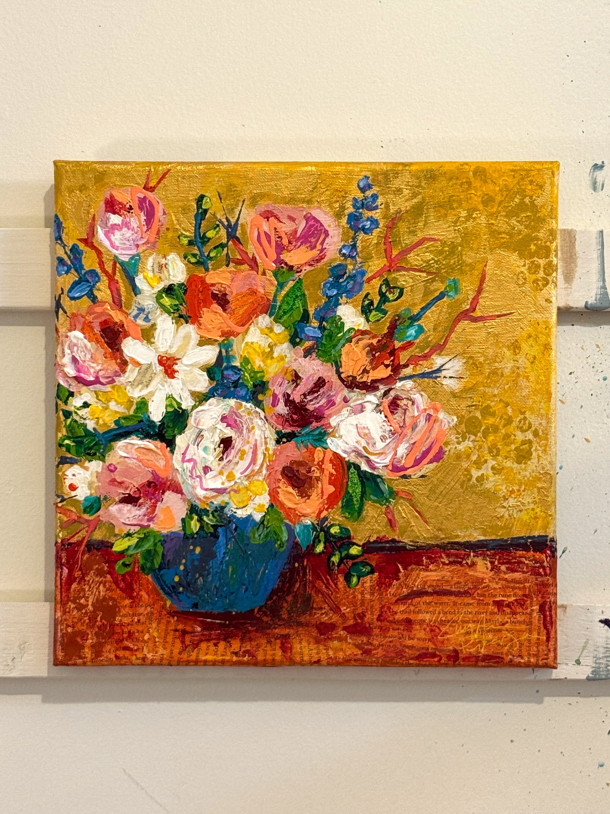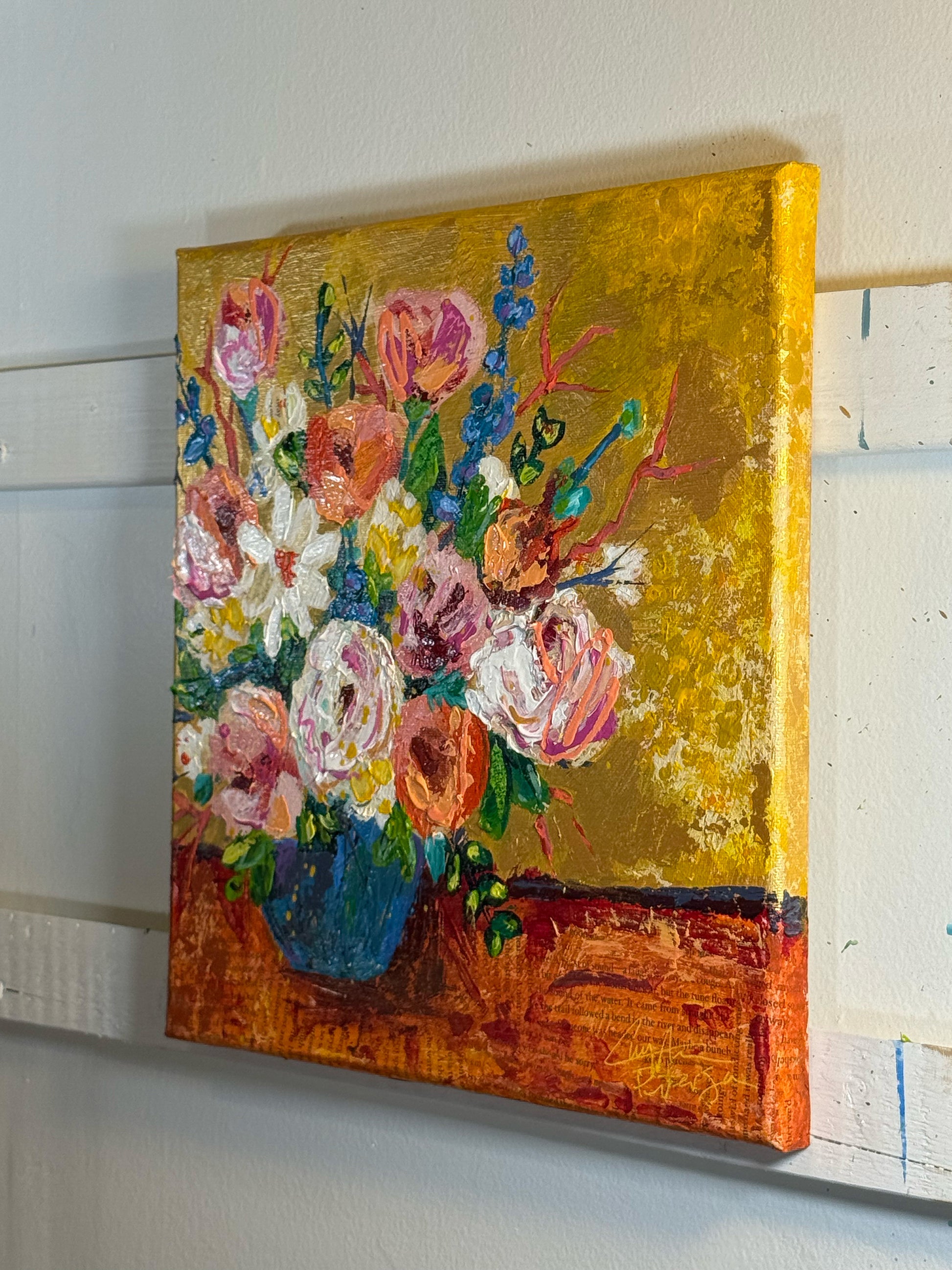A celebration of warmth, bloom, and golden stillness, Summer Honey captures the sweetness of a season suspended in time. Layers of vivid florals spill across a glowing background, evoking the richness of summer afternoons and the quiet hum of bees in the air. Varnished, signed and titled on the back. Artwork extends to the sides - ready to hang.