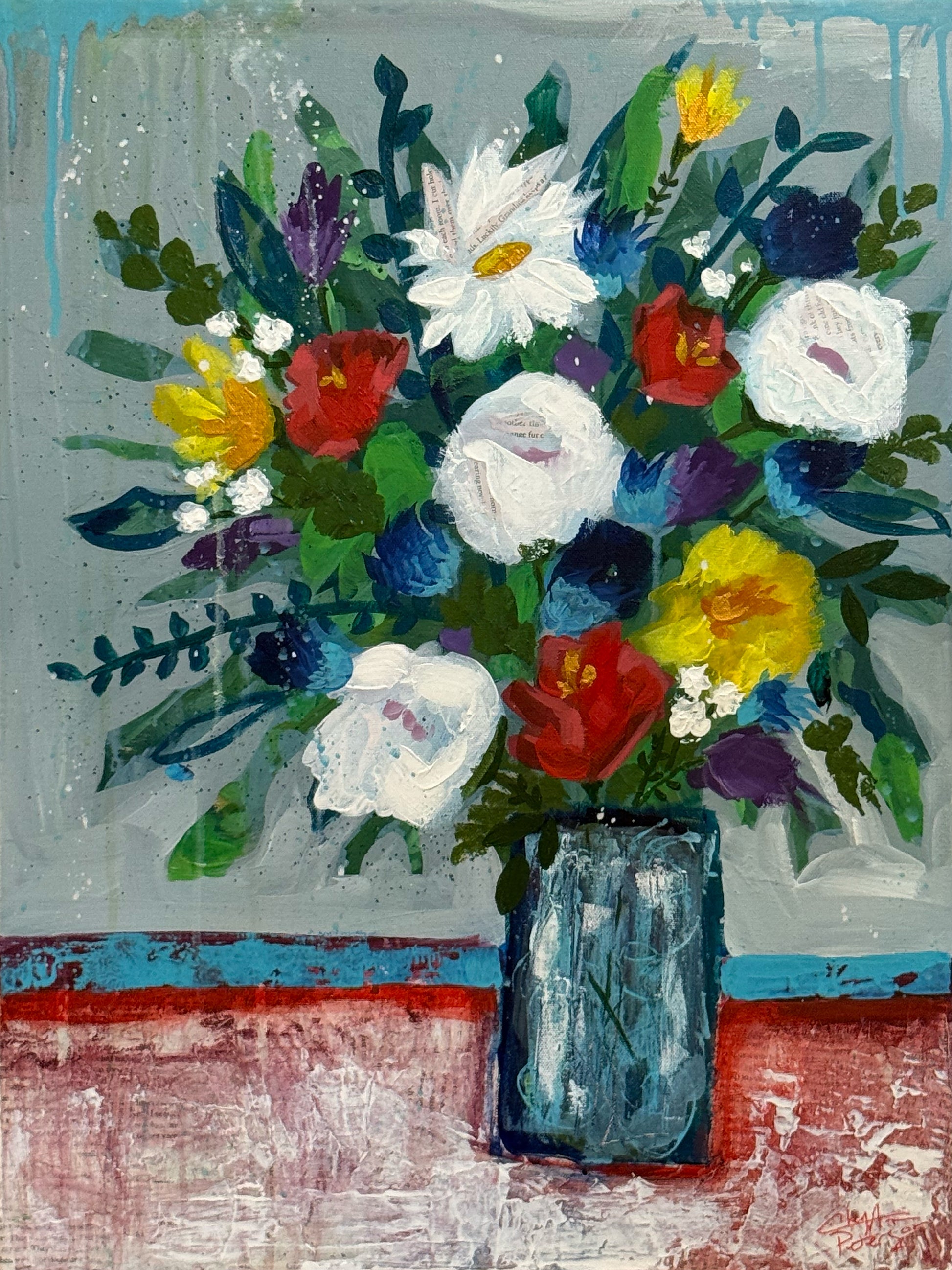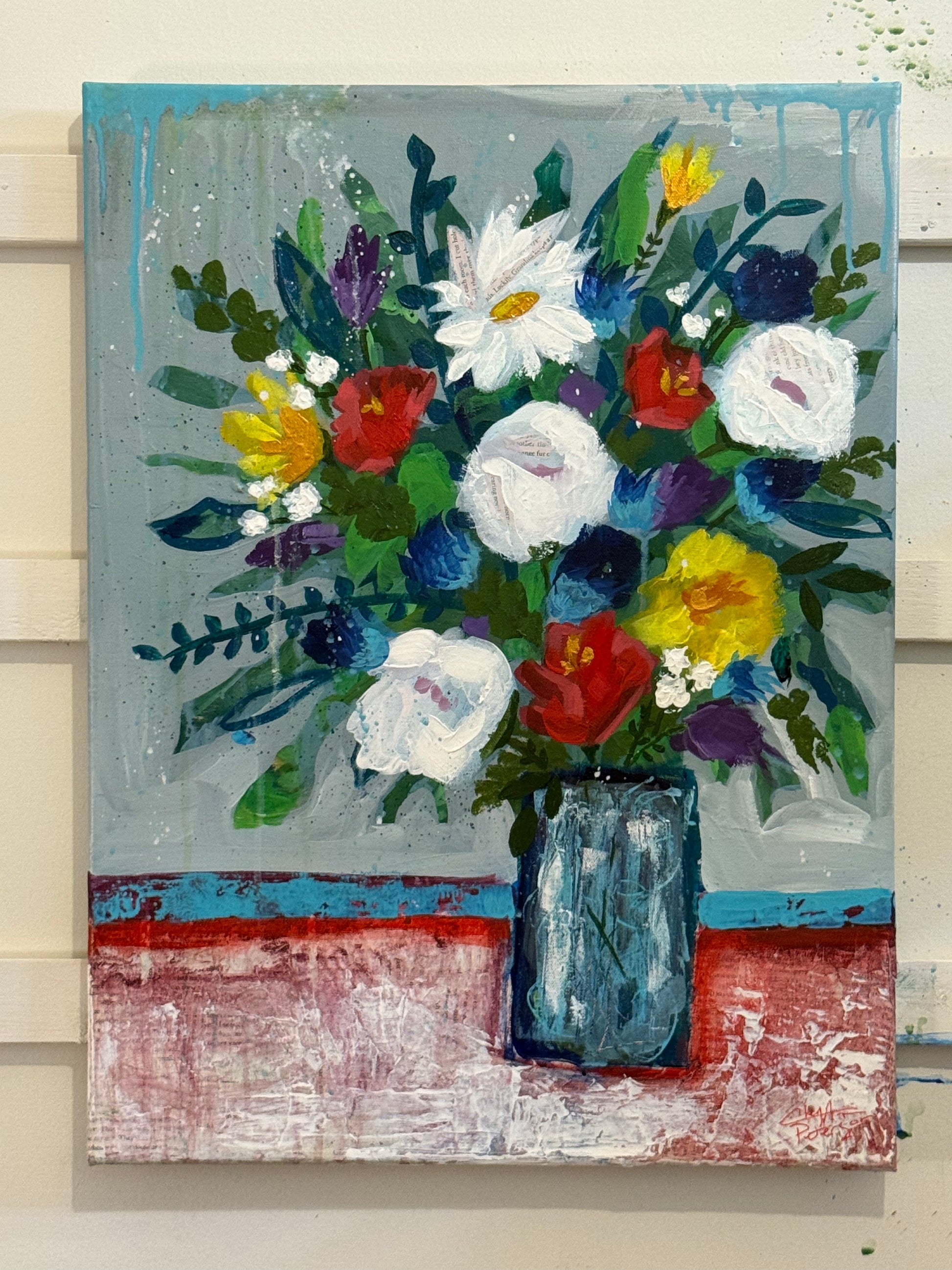A vibrant bouquet of mixed flowers in yellow, red, and white on a blue textured background. Features book pages incorporated in the layers of acrylic paint. Varnished, signed and titled on the back. Artwork extends to the sides - ready to hang.